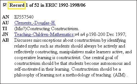 Here is an example of a record (this is an article from the journal Teaching Children Mathematics) from a database called ERIC: