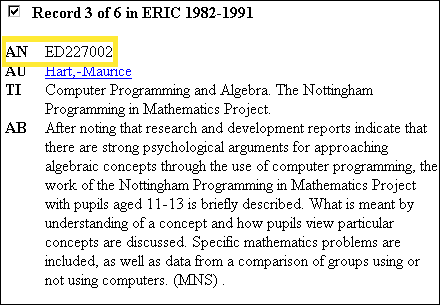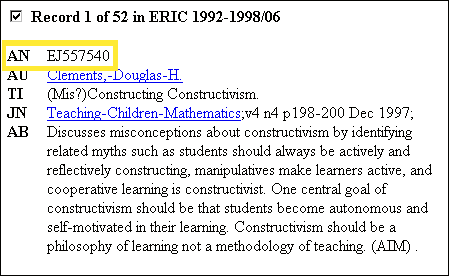At the top of each ERIC record there is an accession number (AN) preceded by an EJ or an ED. The EJ stands for an ERIC journal file. You would look in the library stacks