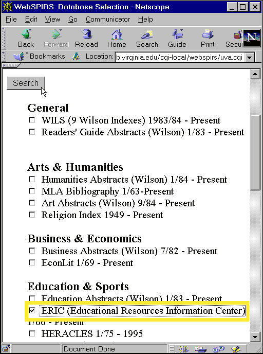 After you enter WebSPIRS, you will see you have access to well over 20 databases. These include Arts & Humanities, Business & Economics, and Education & Sports databases, just to name a few. You can (and eventually should!) search some of these on your own. For now, we will only focus on one, the ERIC (Education Resources Information Center) database, which specializes in indexing scholarly publications in the subject discipline of education. |