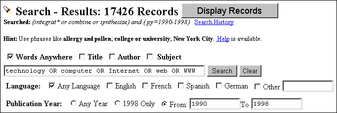 Step 5: Do a wide search on the next key concept (and synonyms)."Technology" is the next concept on our list. Let's do a "Words Anywhere" search for "technology" and its synonyms.