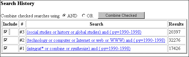 Step 7: Combining the searches.This is perhaps the strongest feature of WebSPIRS. We now want to combine the three search just completed.Either click on Click in the check boxes of all three searches and then click on the "combine checked" button.