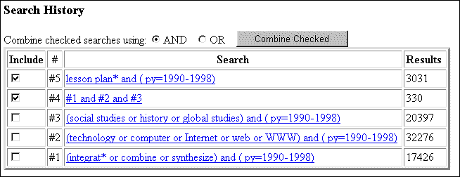 This search yielded over 3,000 records. You now want to combine this wide search with the combined search you performed in Step 7 Go to the Search History again, and combine #4 (your previously combined search) with #5 (your new search).